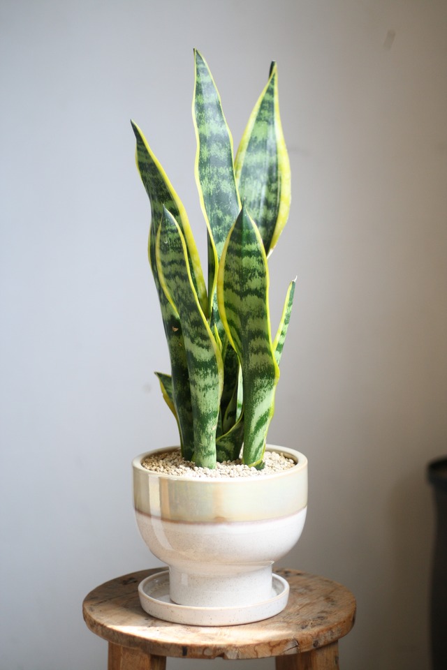 ○北海道、沖縄県、離島への配送は不可となります。 -------------------------------- サンスベリア ローレンチ 陶器鉢植え 受け皿無し 別売りのクリアプレート5号が合います。 鉢を含めた全体の高さ約65cm 空気清浄効果があることで人気のサンスベリア。 乾燥に強く日光が弱くても育ちます。 寒さにも強く、冬は断水すれば耐寒性が増します。 TV台の上などにもオススメです。 土の表面に化粧石を敷いています。 写真の現物をお送りいたします。 撮影日 2026/02/26 植物は日々成長しています。 写真はご参考程度にお願いします。 配送用の箱はリサイクル段ボールを利用する事がございます。 【置き場所】 明るいお部屋で育てます。耐陰性も強く窓から離れていても大丈夫です。 真夏の直射日光は避けてください。 冬は5℃以下にならない室内で管理してください。 【お水やり】 成長期(夏)は2週間に1回たっぷりとあげます。 春と秋は月に1回、 冬は断水します。(1〜2月)